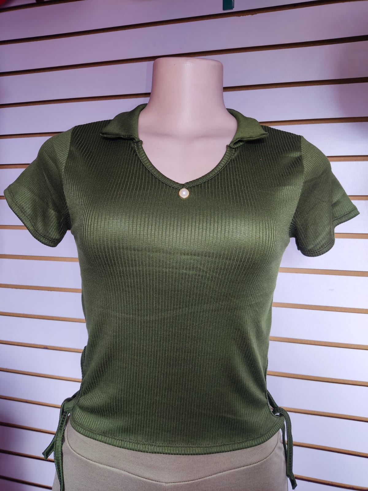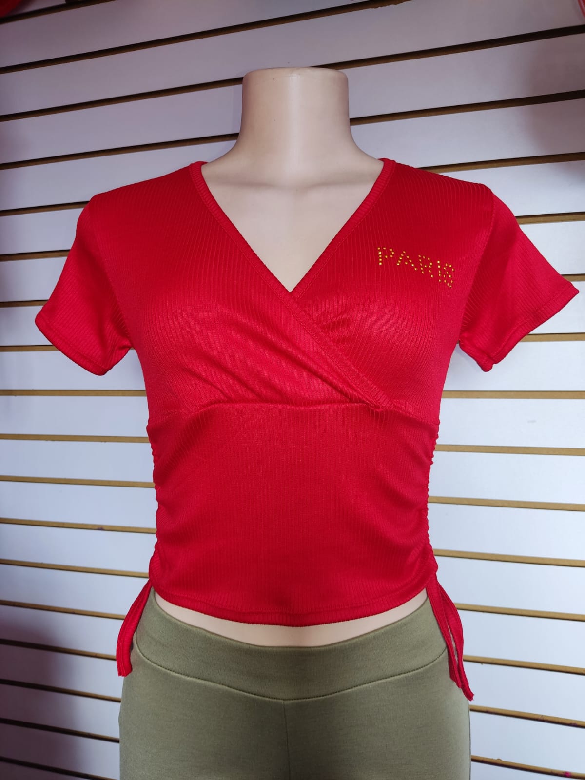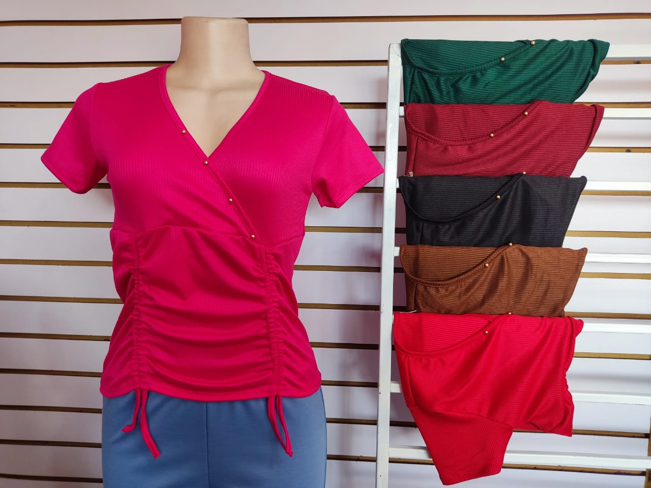 Blusa juvenil en tela de Rib, 6 colores, con pita para jalar y perlas, precio de mayorista